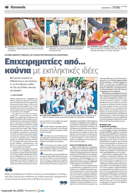 FULL PAGE REVIEW FOR APPOLLO BY EPEIKON, AWARD: INNOVATIVE PRODUCT AND ALSO THE OTHER TWO AWARDS OFFERED BY SEN JA Greece, FROM THE REPORTER MRS CHARA KALLIMERI AT THE NEWSPARER “IMERISIA”